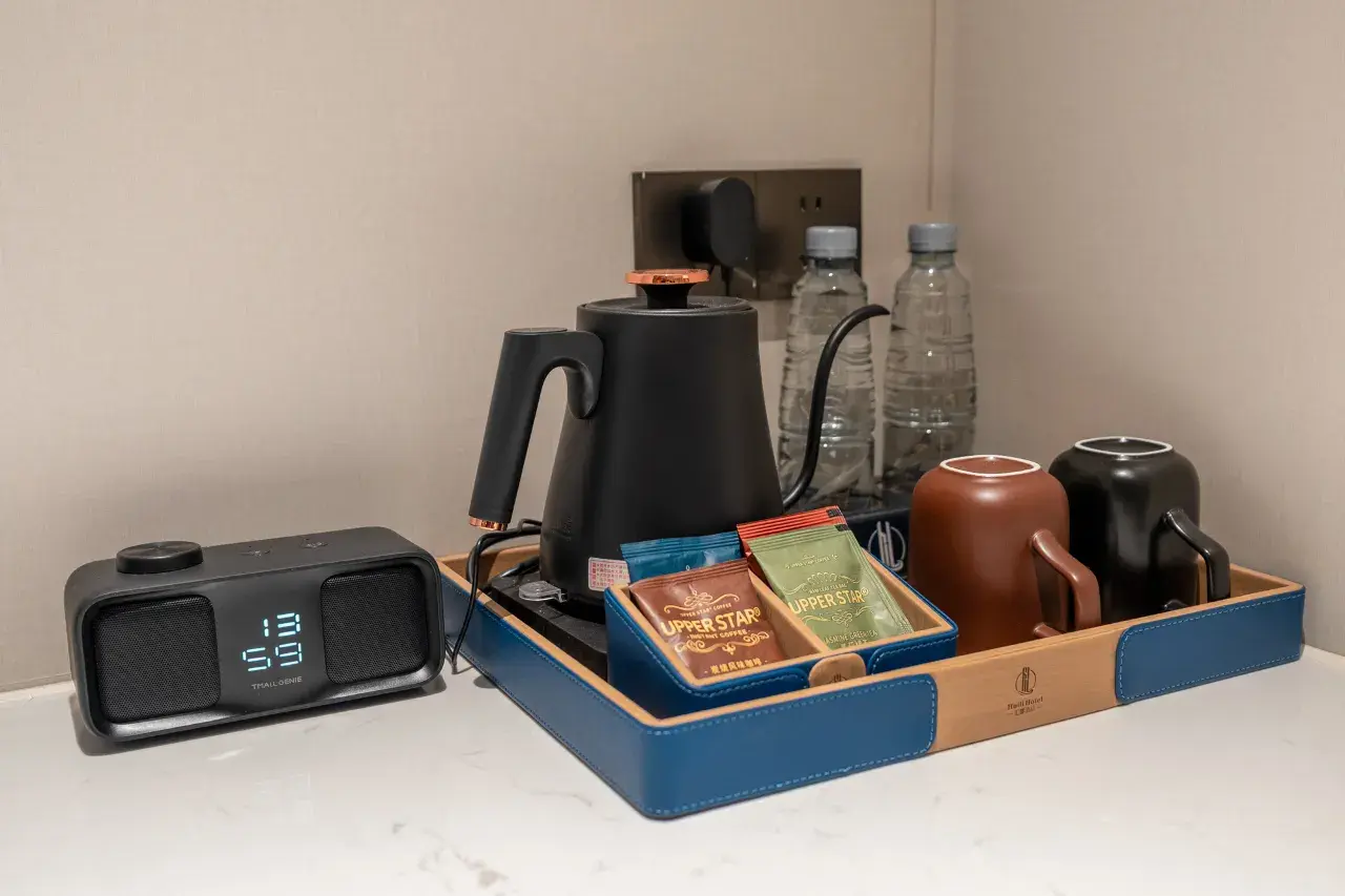 • Appliances: Refrigerator, electric kettle, and coffee/tea maker with tea bags.